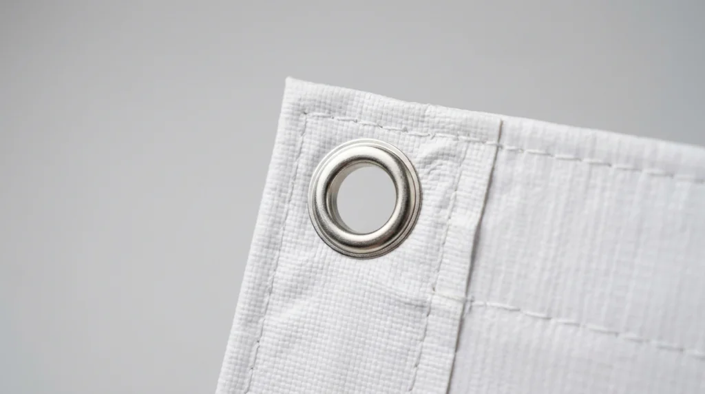 Di banyak kasus, tepi perlu diperkuat supaya area sekitar lubang tidak jadi titik lemah. Penguatan seperti kelim atau heat welded seam membantu tepi siap menerima beban dari mata ayam.
