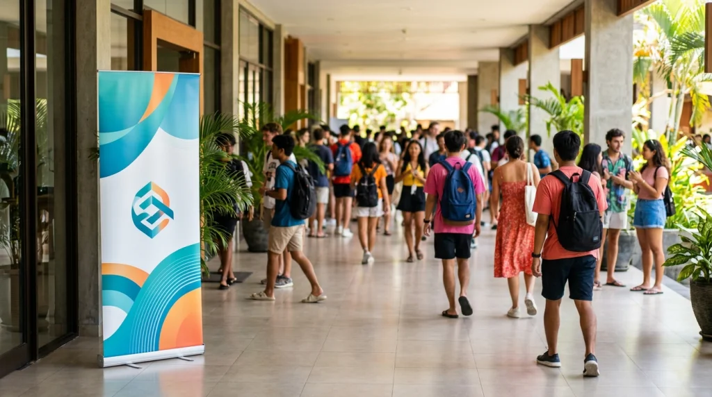 Coba bayangkan kamu baru masuk ke sebuah pameran atau event kampus. Di area yang ramai, ada booth yang berdiri rapi dengan banner vertikal yang langsung terlihat. Tulisan di sana jelas dari beberapa langkah, desainnya tampak “jadi”, dan alatnya tidak membuat panitia repot. Roll up banner seperti inilah yang biasanya jadi pilihan, karena siap dipakai, mudah dibawa, dan pesan promosinya cepat sampai.