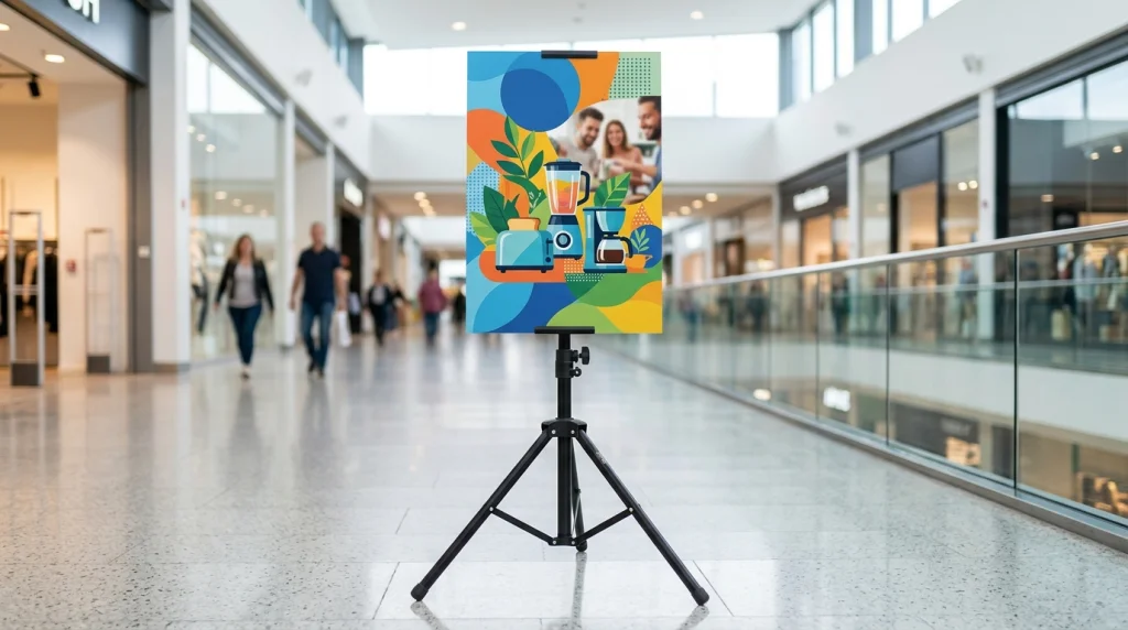 Bayangkan kamu baru saja masuk mall dan melihat sebuah display berdiri berkaki tiga di dekat etalase. Sekilas, otakmu bisa saja menangkapnya sebagai tripod kamera yang biasa dipakai buat foto. Tapi begitu kamu mendekat, yang dipajang di atasnya jelas bukan perangkat kamera, melainkan media promosi: gambar produk, promo, dan informasi yang langsung kebaca.