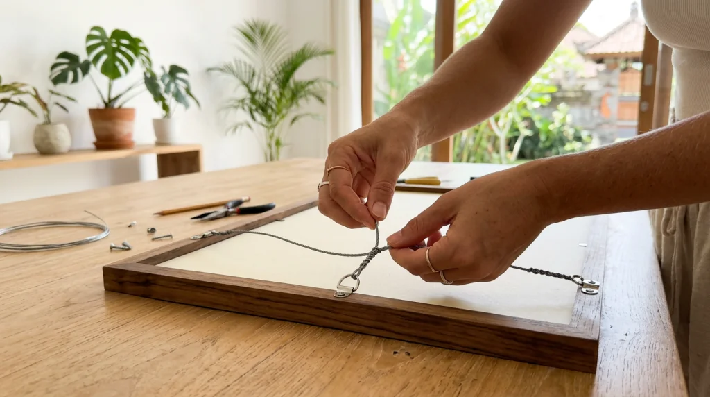 Mekanisme dasarnya sederhana: anchor point dari D-rings menahan beban di belakang frame, lalu loop picture wire membentuk jalur beban menuju kait dinding. Kombinasi ini membuat posisi karya lebih bisa diprediksi dan hasil akhirnya cenderung rata.