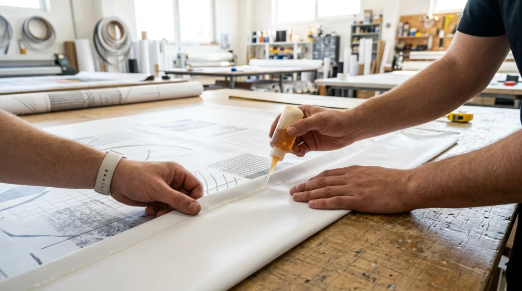 Kalau yang kamu kerjakan repair minor, fokusnya bergeser. Kamu harus membersihkan area yang rusak lebih dulu, lalu oles tipis agar tidak mengganggu tampilan dan keluwesan bahan saat banner dipakai. Waktu “handling” juga bisa terasa berbeda karena kondisi lingkungan dan interaksi dengan media, jadi tetap ikuti pola curing agar kekuatan tidak setengah matang. Kalau memungkinkan, lakukan pre-test di potongan sisa sebelum mengerjakan area utama.