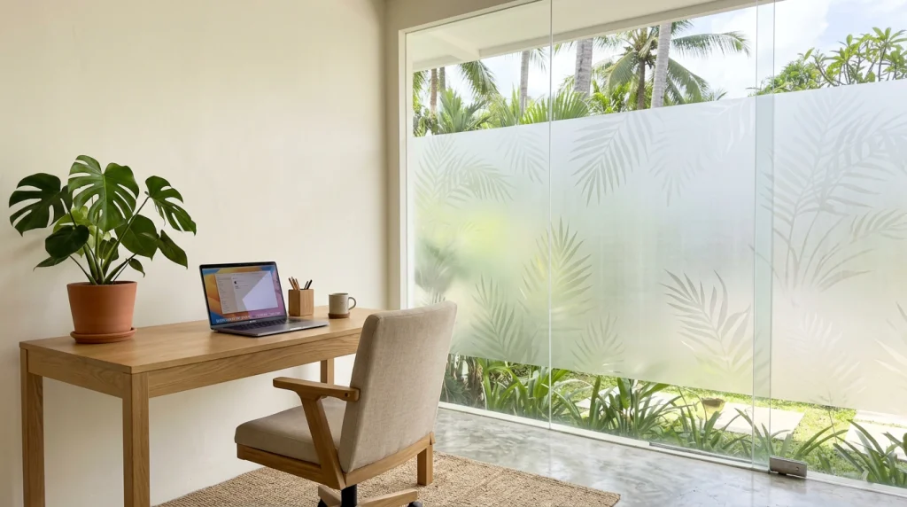 Pikirkan ini: Anda sedang ingin bikin ruangan lebih privat, tapi tetap pengin cahaya matahari masuk. Kaca besar di kantor atau rumah terlihat “terlalu terbuka”, jadi orang dari luar bisa melihat ke dalam. Solusinya biasanya tirai atau gorden tebal, tapi hasilnya sering bikin ruangan terasa sumpek.