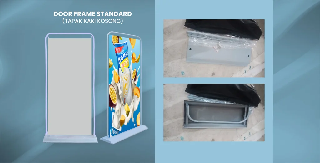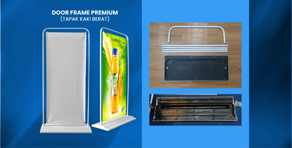 Sesuai dengan namanya yang berbentuk seperti Pintu, Door Frame Banner terbuat dari besi di bagian Frame nya untuk mengaitkan Banner diatas dan dibawah agar tahan dari tekanan arah depan dan belakang. Bentuknya yang simpel dan mudah dipasang hanya terdapat perbedaan pada bagian Tapak Kakinya.