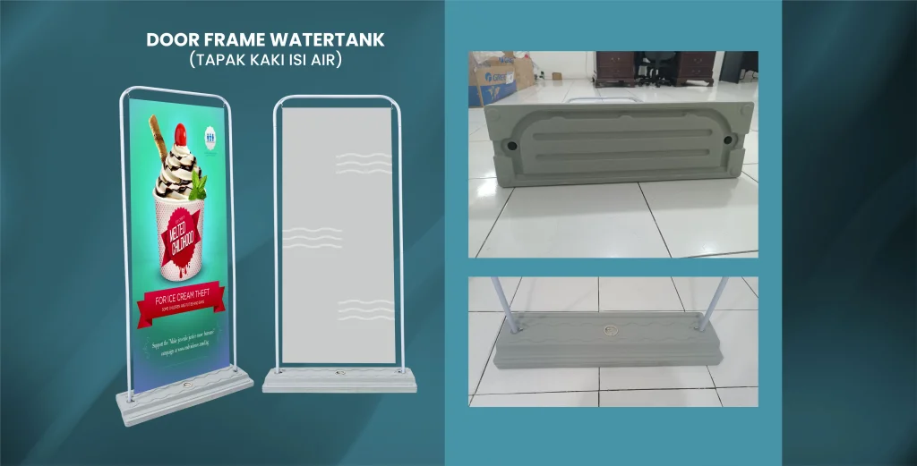 Door Frame Watertank memiliki Tapak Kaki yang bisa di isi Air sebagai Pemberat agar Door Frame tetap Stabil. Pengisiannya pun cukup mudah dengan membuka penutup lobang bagian atasnya. Door Frame Watertank adalah alternatif Door Frame dengan Tapak Kaki berbobot.