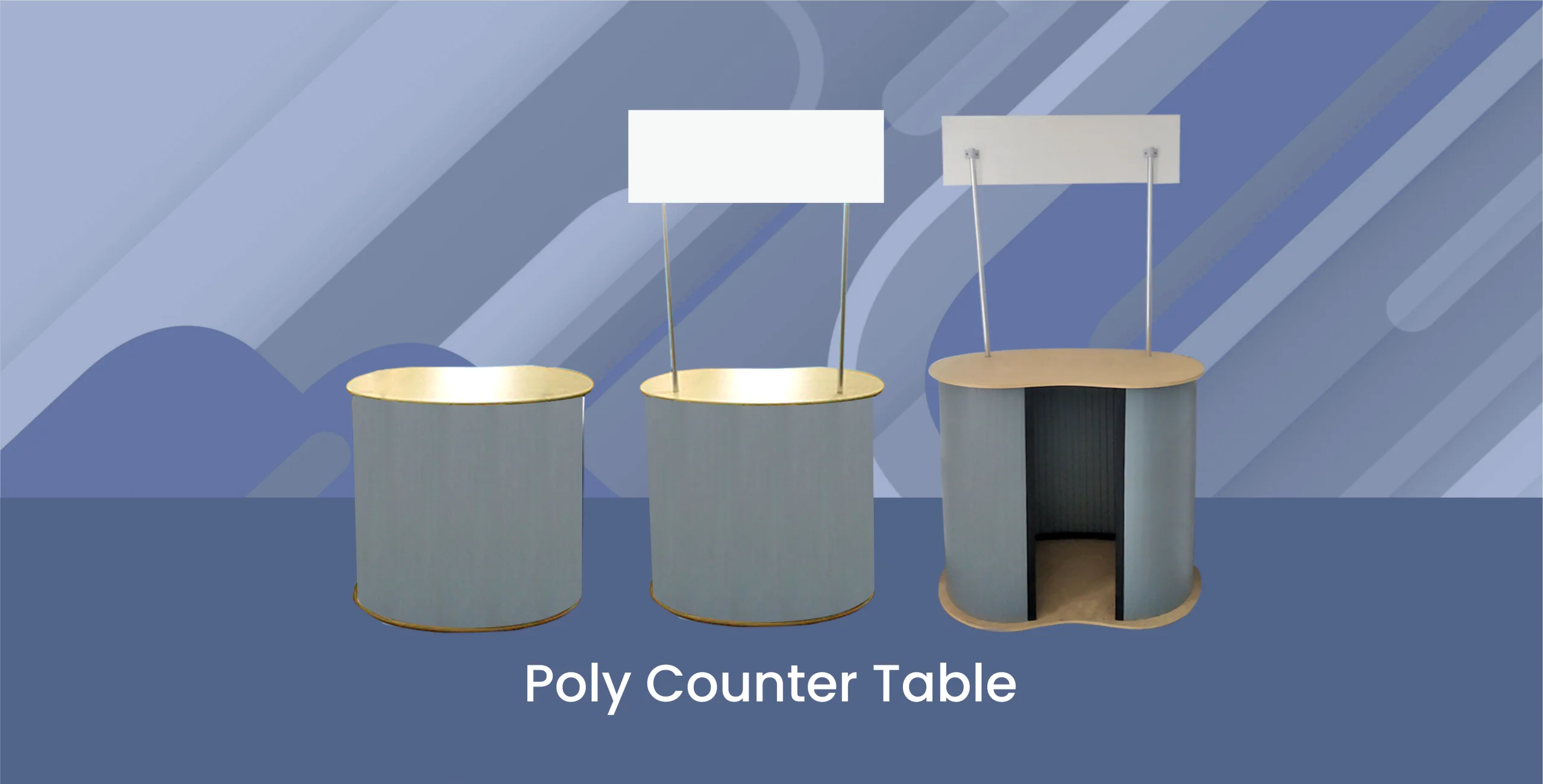 Poly Counter Table adalah Meja Promosi berbentuk Oval dengan konsep yang simpel minimalis terbuat dari 2 Tatakan Kayu dengan Body Polycarbonate Corrugate yang bisa mengikuti kelengkungan Oval (Pemasangan hanya menggunakan Velcro yang sudah terpasang kuat) dan ada tambahan Variasi yaitu Header bagian atas yang ditopang Tiang Besi.