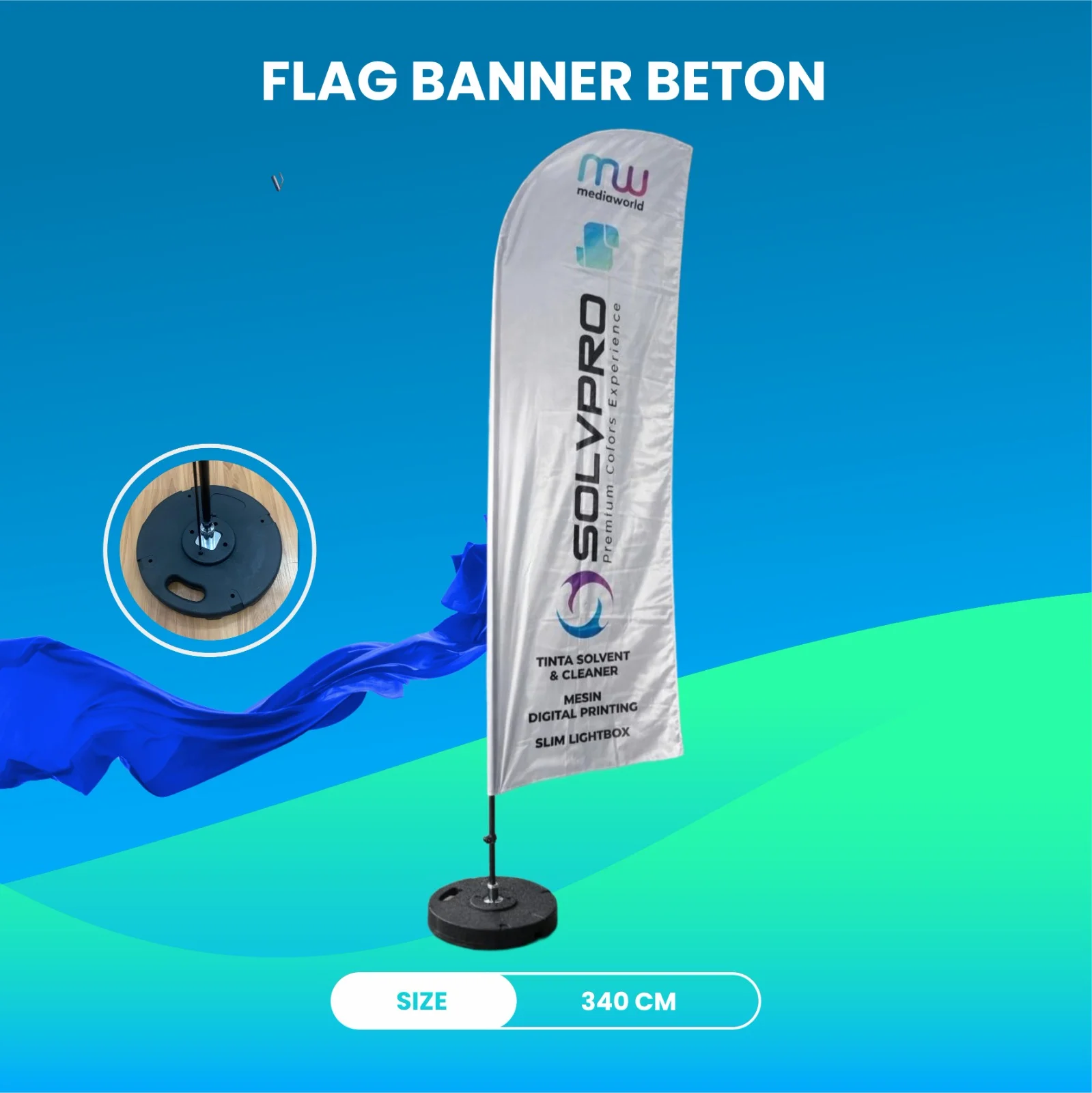 Flag Banner Beton adalah stand banner dengan base beton yang kuat dan stabil, dirancang khusus untuk kebutuhan promosi di area outdoor maupun indoor. Dengan penyangga yang kokoh, flag banner ini mampu berdiri stabil meskipun digunakan di area terbuka.